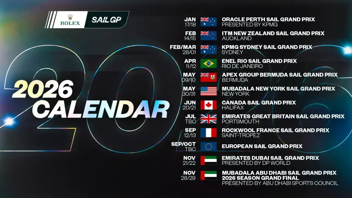 Die Saison 2026, die im Januar 2026 beginnen wird und für einen Zeitraum von 11 Monaten stattfinden wird, wird in Perth (vom 17. bis 18. Januar) vor der Rückkehr nach Auckland (vom 14. bis 15. Februar) debütieren und wird in Sydney (vom 28. Februar bis 1. März) gipfeln. Die führende professionelle Service-Firma KPMG Australia wird als offizieller regionaler Partner an Bord sein und in den drei Veranstaltungen der Region Asia-Pacific ein erweitertes Engagement verkünden, darunter der Gastgeberpartner des Oracle Perth Sail Grand Prix, der führende Rückkehrpartner des KPMG Sydney Sail Grand Prix und der offizielle Partner der ITM New Zealand Sail Grand Prix - 124; Auckland.