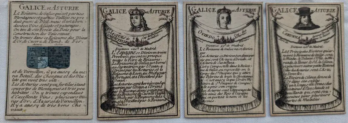 Das stimmte dank des französischen Spiel- und Kartenprofis Jean Baptiste Mitoire... der ersten Kopie seiner Hände, erscheint im Birtish Museum in London, in einem bestimmten Raum. Das große Londoner Stück hat Sätze von Niederlande, Irland, Italien, Spanien, Portugal, Afrika, Amerika und Asien... Die Hermeric Association hat eine der zahlreichsten Stücke in ihrer Original-Kartenspiel-Kollektion, in einem ausgezeichneten Zustand... gewidmet dem alten Königreich Galicien und offenbar von der in dieser Arbeit verwendeten Typografie enthält als Anhang zu ihr das Königreich Asturien: