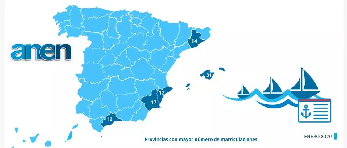Le marché de la location de bateaux de plaisance maintient un faible début de l'année, avec 37 inscriptions en janvier, soit -27,5% par rapport à janvier 2025. et la charte représente en janvier 21,0% du total des inscriptions (contre 26,4% de l'année précédente), un indicateur que le recouvrement du loyer reste non consolidé ce mois-ci. En janvier, les îles Baléares ont concentré le plus grand nombre de inscriptions, avec 31 unités (17,6 % du total). Il est suivi par Murcia, avec 17 inscriptions (9,7 % du marché).