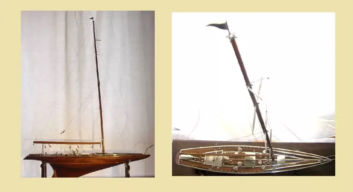 Constellation, America's Cup 1964: Es wird in einer Antike von Madrid verkauft, es ist aus 925 mm Silber und Holz von Mansonia gebaut. Es ist 60 cm lang in Flotation, und das Gesamt ist 65 cm. Die hohe Gesamtzahl des Schiffes beträgt 80 cm mit seinem Kiel. Baden, Boot, Kreuzfahrten, Biss, Tangons, Tambouches, etc., in Silver of First Law. Silberfaden, 0,3 mm. Verkaufspreis EUR 5,900.