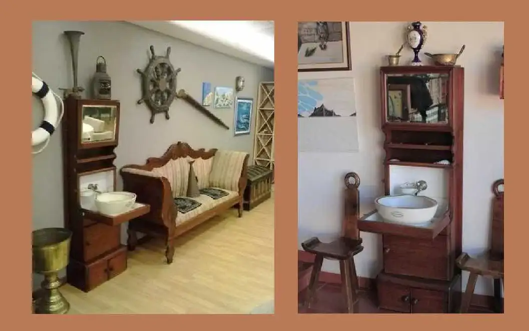 2. Klasse Kabine Boot Waschbecken. aus Glasgow, im RMS TITANIC UND OLYMPIC Jahr 1912 verwendet, gehörte zu den White Star Leinen; es ist aus massivem Mahagoniholz, und ist zum Verkauf in der Errichtung eines Antiquitätengeschäfts in Vigo, für 4.500 Euro.