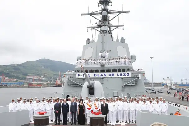 The "Blas de Lezo" frigate (F-103) was launched on May 162003the same day that the frigate Méndez Núñez was set in the ground,performing its sea tests between 7 and 11 September 2004.It was handed over to the Navy on December 16, 2004, and conducted missile launch tests (CSSQT) in the United Stateswith the destroyersAmerican USS Howard and USS Halseyin September 2005.