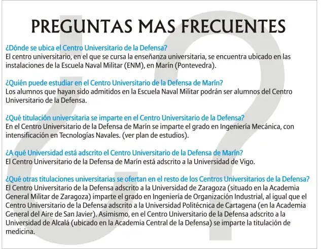 The rules governing the selection processes for admission to the University Defence Centres require applicants to pass psychophysical tests (physical tests, psychological tests and medical examination), as well as English language tests. The website of the Ministry of Defence (http: / / www.reputamiento.defensa.gob.es) Expands information on the entry process. The documents related to the entry can be found in the Normative section of the Centre of the website of the University Centre of the Defense of Marin.