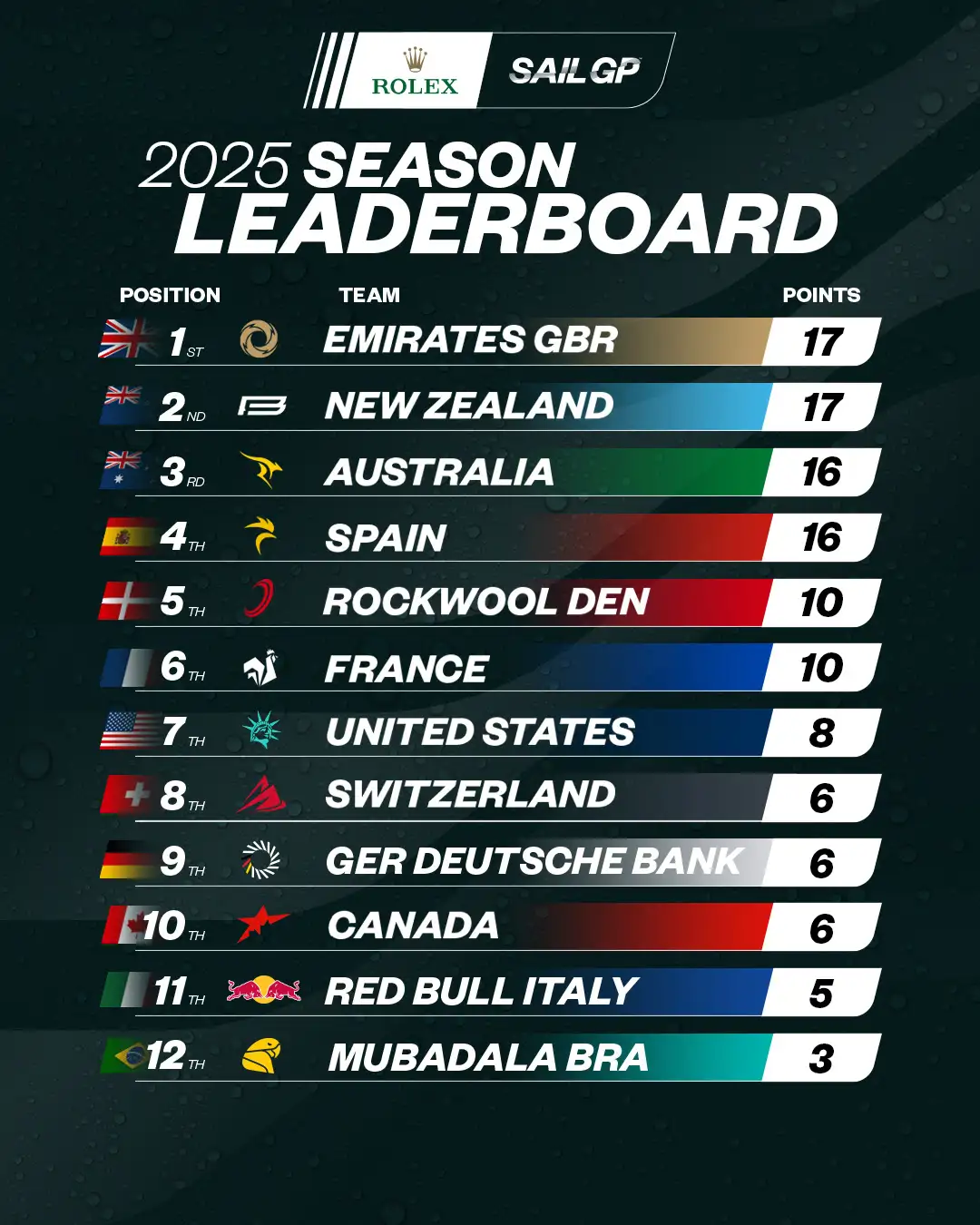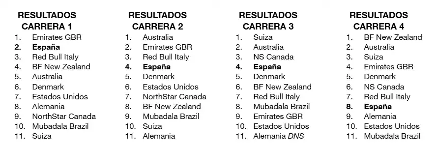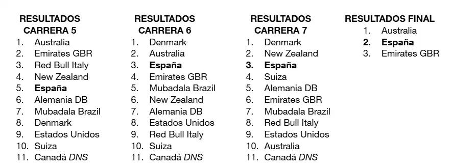 Après la deuxième épreuve de la saison, l'Espagne est quatrième au classement général, un seul point de la Nouvelle-Zélande et de la Grande-Bretagne, leaders de la compétition et liés à des points avec des tiers, Australiens.