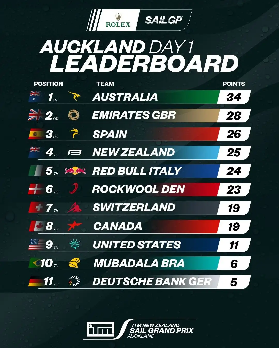 À la fin de la première journée du Grand Prix ITM New Zealand Sail Auckland, l'équipe espagnole SailGP est troisième du classement avec 26 points, seulement deux de moins que Emirates GBR, qui est deuxième avec 28. Demain dimanche, les Espagnols se disputeront deux manches de plus pour essayer d'être en Grande Finale.
